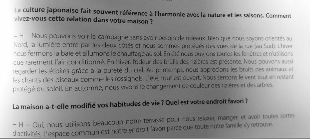 Ce que j’ai compris, à travers les différents témoignages recueillis dans ce livre, est le rapport très particulier que les Japonais ont avec leur maison. Une construction qui n’est pas éternelle, tout comme ses habitants. Un espace à la fois très conscient de son environnement, et volontairement déconnecté. On y vit autrement. On se déchausse. On prend le temps de passer de dehors à dedans. On est seul dans la ville, et ensemble à la maison. On aime profiter de la lumière et des paysages, sans se sentir envahi. La maison est le lieu où l’on se ressource.