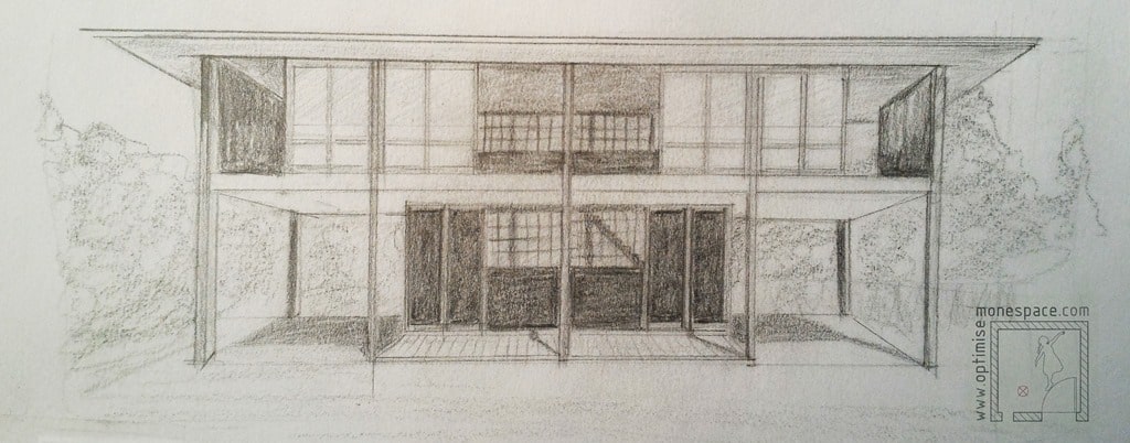 Par exemple, on utilisera le procédé de “shakeï” (“emprunt de paysage”, utilisé dans les jardins japonais) pour placer une fenêtre qui, depuis l’intérieur, cadrera un rocher, un arbre, une vue mer … tout en s‘évitant la vue sur un bâtiment peu esthétique. L’aspect extérieur des ouvertures (alignement, dimensions identiques) importe moins : l’essentiel est ce qu’elles cadrent depuis l’intérieur.