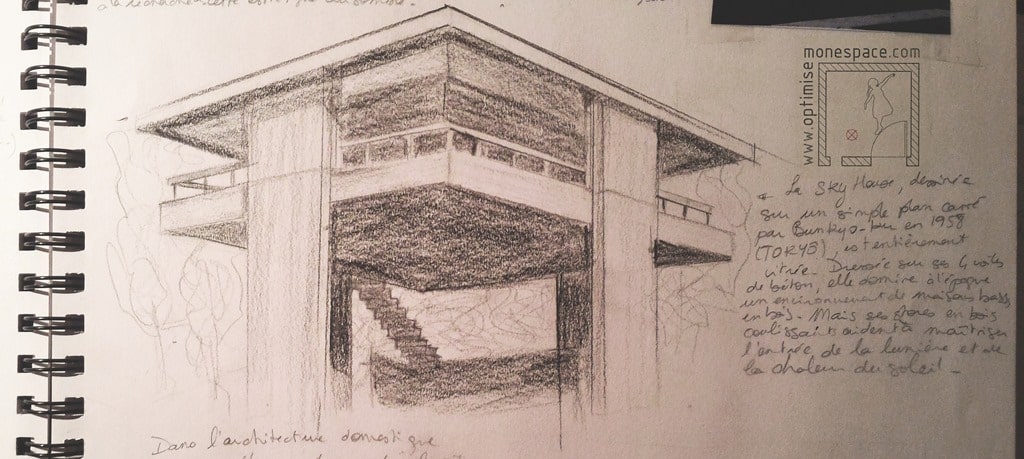 Si, en ville, c’est certainement l’impératif économique qui pousse les Japonais à construire en hauteur comme Azuma (cf ci-dessus), on constate que de nombreuses maisons, comme la Sky house de Kikutake Kiyonori (cf 1ere illustration en haut de l’article), la maison à Zaimokusa de Contemporaries (paragraphe (“emprunter le paysage”), ou encore la Maison à Kugayama de Shinohara Kazuo (ci-dessous) reflètent ce goût de vivre à hauteur des arbres, dans un espace de flottement, quelque part entre ciel et terre:
