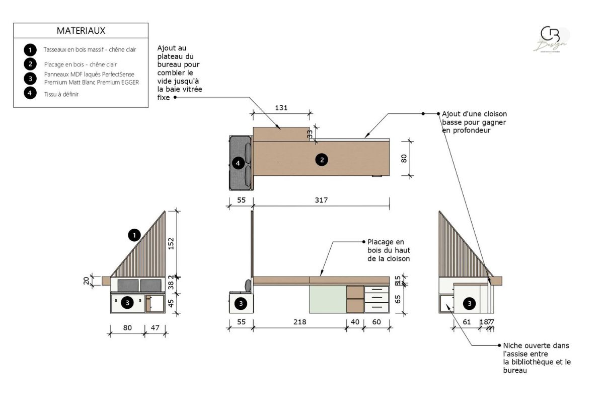 Caroline a proposé une alternative : transformer le grand palier du R+1 en un vrai espace multifonction. Un bureau lumineux pour télétravailler, des rangements intégrés, un coin nuit pour les invités, un lieu de détente pour les enfants… Un palier devenu pièce à vivre, pensée pour toute la famille.