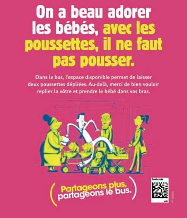 Alors comment pouvez-vous vous imaginer qu’une maman peut très simplement plier sa poussette remplie de courses? (et son enfant avec!) Il y a quelques années j’ai été particulièrement choquée par une campagne dans les bus parisiens qui disait “les bébés, on aime bien, mais les poussettes, faut pas pousser!” Pour moi c’est tout simplement du racisme anti-parents, une stigmatisation qui nous fait passer pour des emmerdeurs. Changer cet état d’esprit: c’est la BASE!