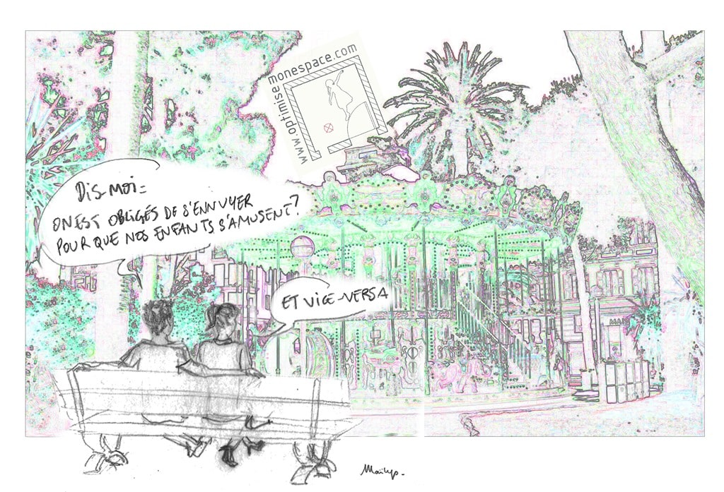 Votre enfant grandit, vous l’amenez au parc, il faut bien qu’il s’amuse, mais son plaisir n’est pas compatible avec le vôtre: on vous aura généreusement prévu quelques bancs très inconfortables, tous pris d’assaut en période de pointe. Vous rêvez d’un petit verre en terrasse, mais vous devez faire un choix: ou vous vous ennuyez au parc et vos enfants s’amusent, ou vous vous détendez au bistrot et vos enfants s’ennuient.