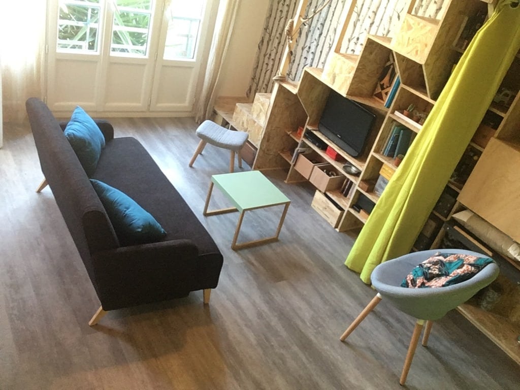 – Les grandes tablées : c’est possible ! Sous la terrasse nous avons 2 tréteaux et une grande planche. Et hop là ! Une grande salle-à-manger en 1 tour de main ! (il suffit de caler le canapé bien au fond de la pièce). En plus avec l’arrivée des beaux jours on profite aussi de l’ouverture sur la terrasse et le jardin.