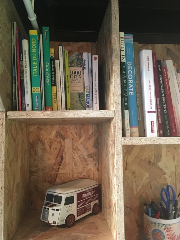 Le parti pris d’un ensemble escalier/bibliothèque/bureau/mezzanine entièrement en OSB, panneau normalement destiné à l’isolation, a été dicté avant tout par le budget miniature qui s’imposait dans le cahier des charges. Son look “bois brut”, sa solidité, et sa composition écologique, ont fini de remplir tous les critères de la Tinyhouse.