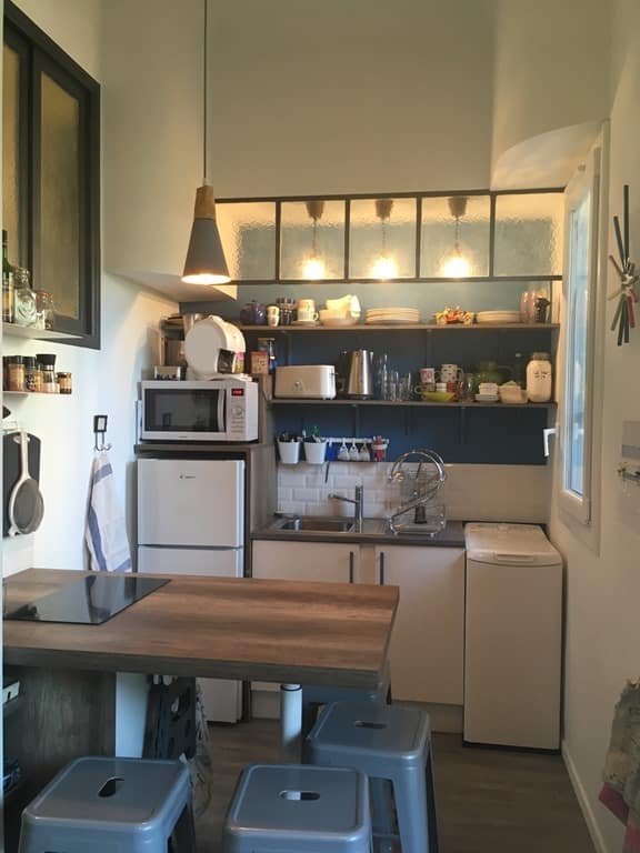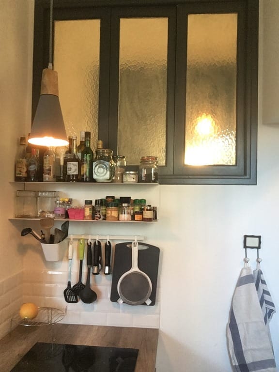 Un semi-îlot a pu accueillir la plaque de cuisson et un espace repas pour 4 personnes ! Pas mal, non, pour une cuisine de 4.5m² ?