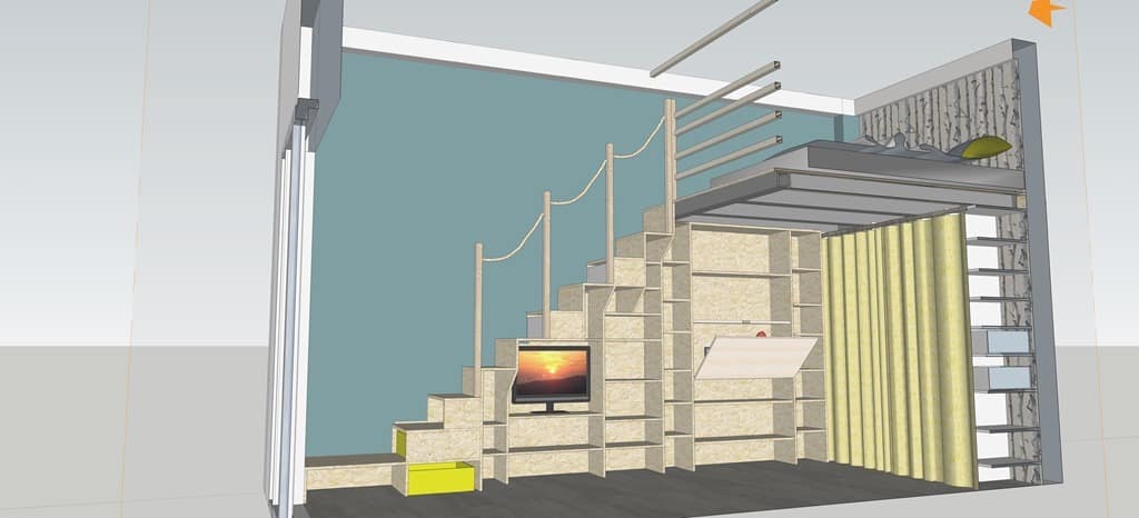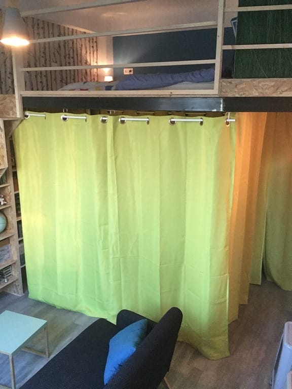 De simples rideaux sous la mezzanine, et hop ! nous voilà bien isolés, sur notre matelas pliable rangé la journée dans le grand placard. Nous aussi, nous avons notre “cabane dans la cabane” et l’impression d’un lit à baldaquin entouré de rideaux le soir