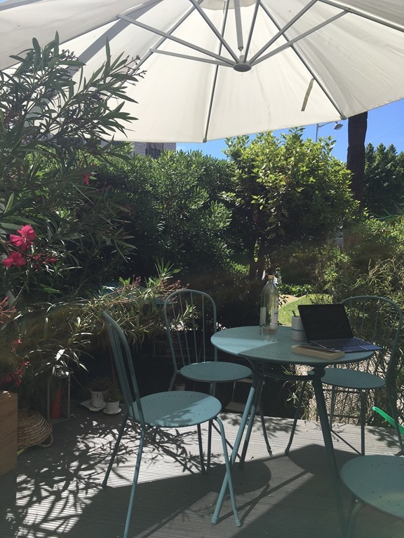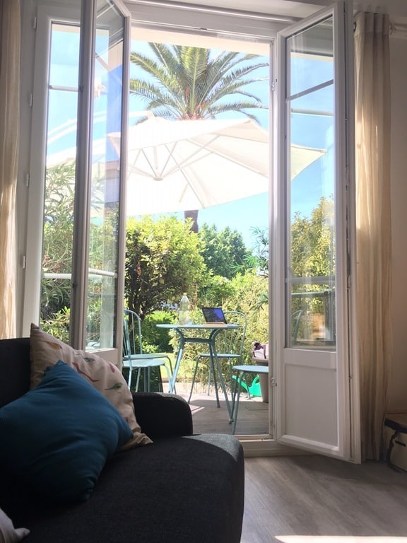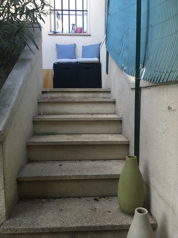 Le gros atout de ce studio était justement son mini jardinet en contrebas (8 marches pour y descendre), mini-jardinet de 20m² qui donnait lui même… sur le jardin commun de la résidence avec son allée centrale.