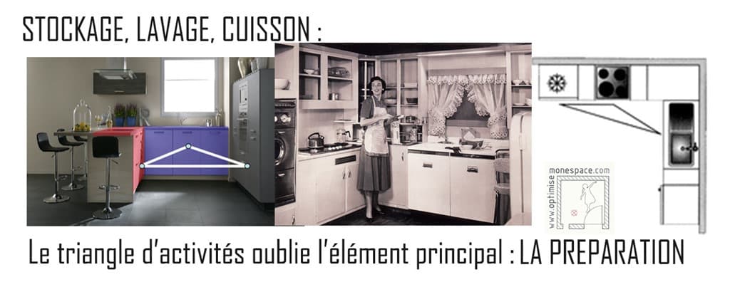 La photo de gauche est une photo tirée du site internet des Cuisines Schmidt, qui présente fièrement le concept du triangle d’activité comme LE concept à retenir pour la conception de sa cuisine.