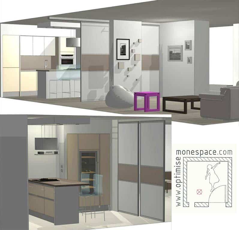 Sur cet autre projet, le couple hésitait entre une cuisine ouverte et une cuisine fermée. Ils se plaignaient de ne même pas pouvoir prendre le petit déjeuner dans la cuisine. En effet, la pièce était meublée sur tous les murs : impossible de mettre une table au milieu sans gêner la circulation. Je leur ai conçu une cuisine hybride : 2 portes coulissantes rentrent dans un galandage et laissent apparaître une cuisine largement ouverte, avec semi-îlot et 2 tabourets. Cette cuisine peut néanmoins retrouver son indépendance du salon en refermant les portes.
