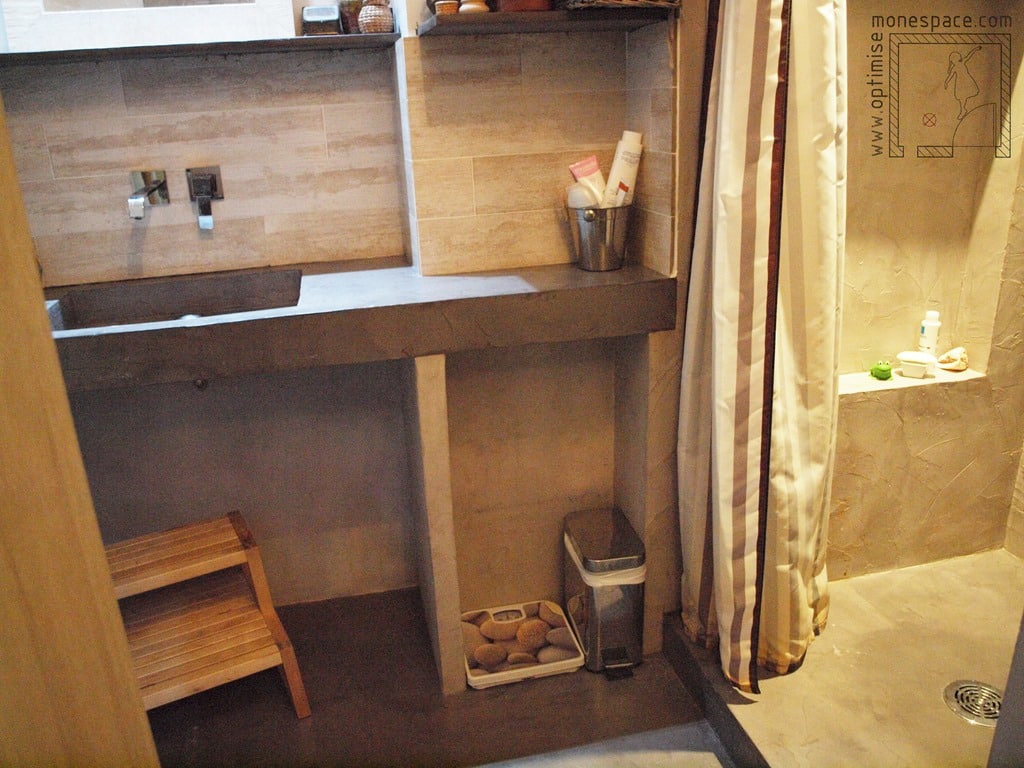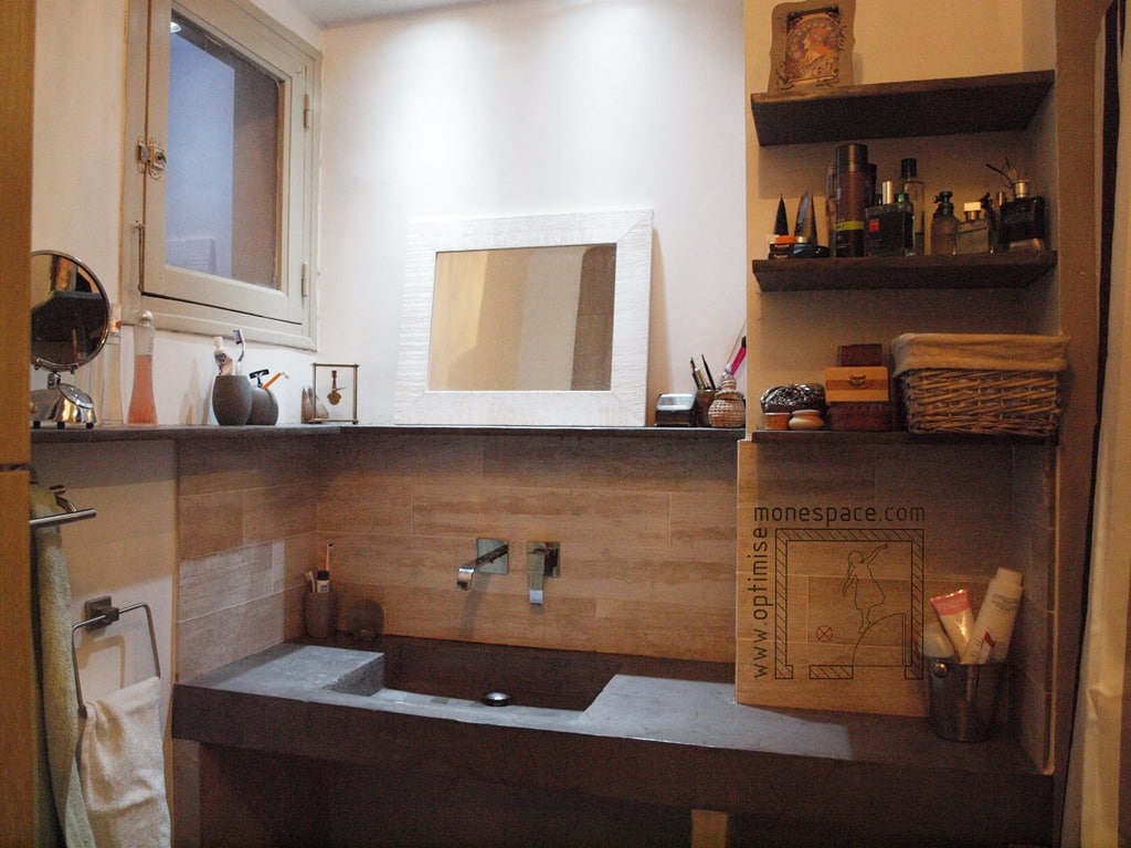 Bonjour Emmanuelle, concernant les murs de ma sdb: autour de la baignoire, revêtement carrelage imitation bois. Et le sol, les autres murs, et la vasque, sont enduis de béton ciré. L’étagère et la vasque ont été sculptées en béton cellulaire avant d’être ensuites de béton ciré.