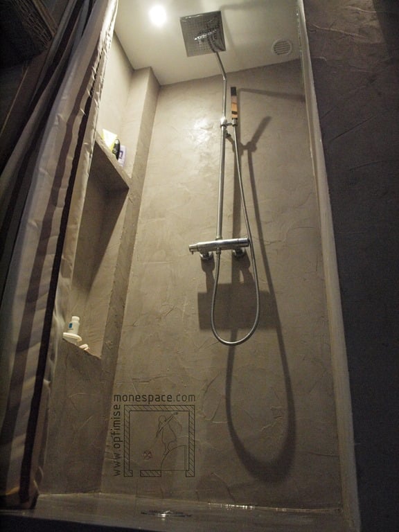 J’aurais juste une petite question au sujet de la douche dans la SDB 1ère version : En quoi est fabriqué le mur avec les deux étagères ? (Celle pour le savon et celle pour poser son pied ; idée géniale !) Pas en bois, ni en plâtre, je suppose ? Avec l’eau, ça me semble assez impossible mais alors…?