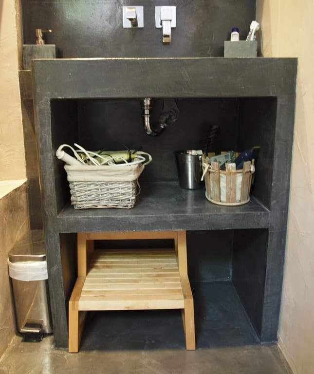 – Une grande vasque sur mesure taillée dans du béton cellulaire et enduite de béton ciré :