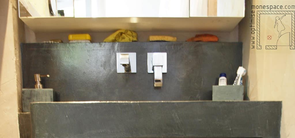 Mon robinet mural nécessitait de doubler ma cloison, épaisse de seulement 5 cm, pour être encastré. J’ai donc doublé cette cloison uniquement jusqu’à la hauteur nécessaire (1m20). Puis j’ai accroché le meuble miroir sur le mur d’origine, en retrait de 5 cm : cela m’a permis d’avoir plus de recul depuis le bord de ma vasque. Mais j’ai volontairement laissé un espace de 5 cm de hauteur pour caser éponges et savon détachant sous ce meuble. Ainsi, ils sont à la fois cachés et très accessibles !