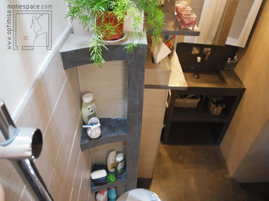 J’ai profité d’un espace vide entre la baignoire et la gaine technique, pour faire faire des étagères sur mesure, qui suivent la forme de la baignoire !
