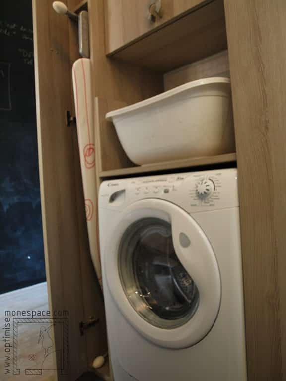 Il suffit de 15 cm de large pour ranger une table à repasser (en comptant de la marge pour la rentrer et la sortir facilement !). Alors, pourquoi faire un placard de plusieurs dizaines de centimètres, que l’on ne va pas pouvoir optimiser avec des étagères, à cause de la hauteur de cet objet ? Pour éviter de la voir traîner dans le couloir, je lui ai créé un placard sur mesure : ce qui m’a permis de créer, à droite du lave-linge, un placard plus large avec des étagères de haut en bas. Vous remarquerez que dans seulement 120 cm, une logique d’utilisation est respectée :
