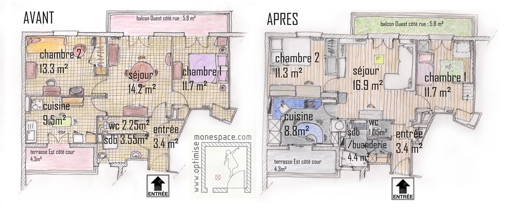 On voit qu’au niveau de la distribution des pièces, finalement, le plan a très peu changé : les pièces sont toutes au même endroit. De simples petits réglages ont rendu ce plan “presque parfait” malgré les 10 ou 15m² “manquants” que j’avais exigé à la base dans ma recherche d’appartement.