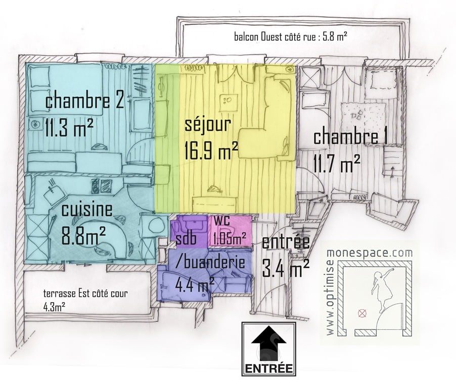 Mais ce n’est pas tout : vous voyez le carré violet ? J’ai avancé le wc au maximum pour rétrécir cette pièce à 1.05m². Du coup, la sdb gagne 1 m² : avec son m² en plus et un agencement beaucoup mieux pensé, on gagne une baignoire et un espace buanderie !