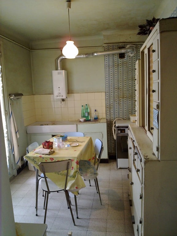 Dans la cuisine, une épaisse couche de graisse est visible sur tous les meubles. Le papier peint est collant.