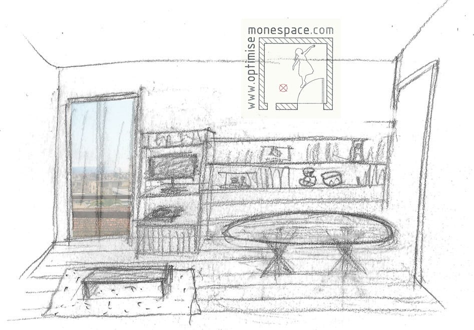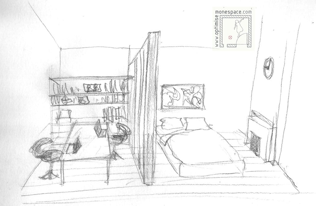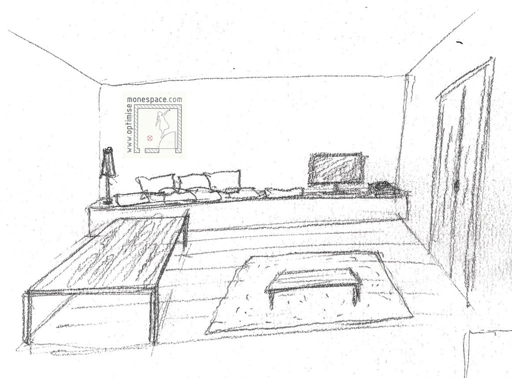 Génial, non ? Une bibliothèque qui servirait de séparation, tête de lit d’un côté, bureau de l’autre … avec percée vers la mer depuis le bureau !