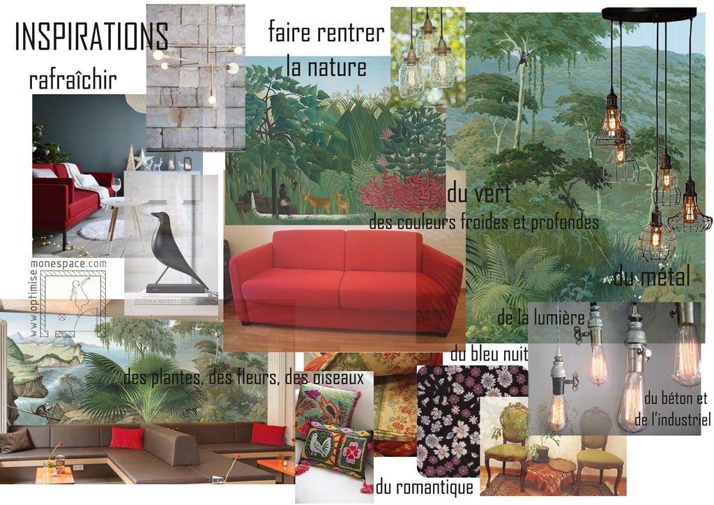 Voici les planches d’inspiration que j’ai proposé à Carlo et Daniela, en partant de leur canapé rouge, de leurs meubles de famille et de leur plante verte :