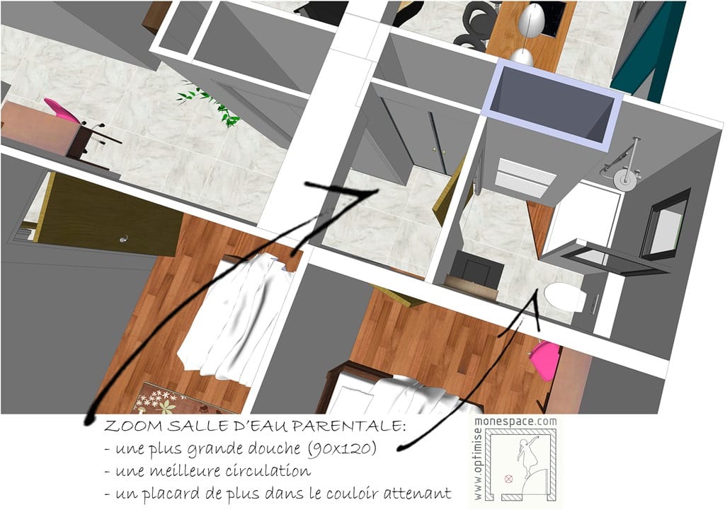 Le surplus de couloir et le mauvais agencement des salles-de-bain seront réglés dans le même temps: