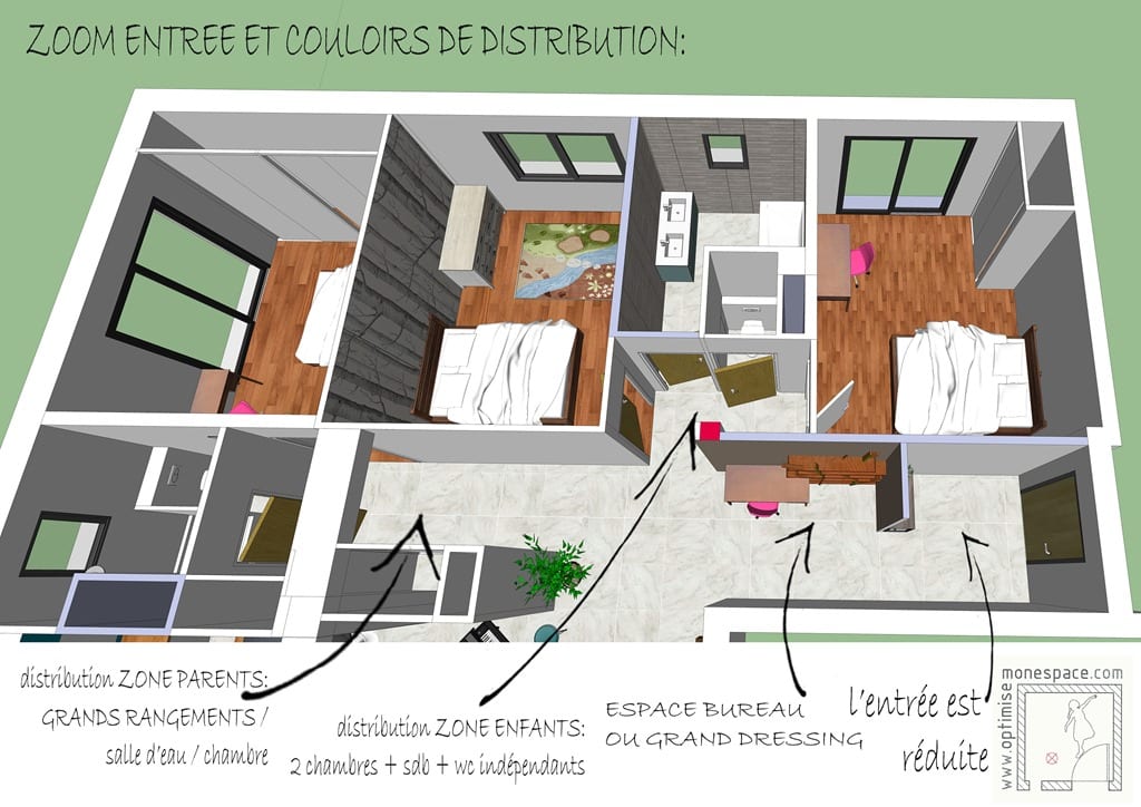 Reste à s’occuper du second problème: le hall d’entrée immense, le surplus de couloirs. Puis l’absence de wc indépendant et l’agencement des salles-de-bain.