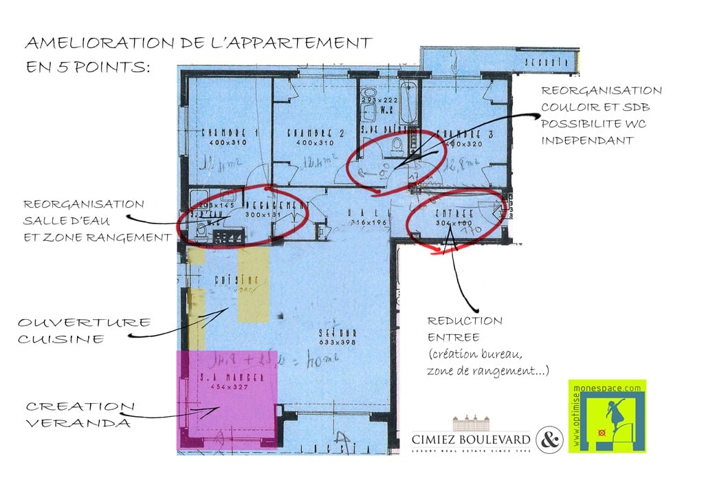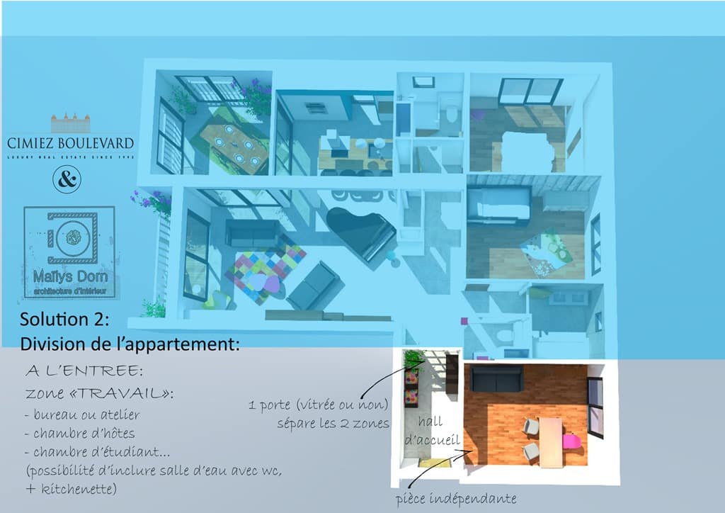 Cet appartement est à la vente à l’agence Cimiez Boulevard à 3700 €/m2 (434 000€) avec un parking attenant. En investissant 60 000€ de travaux, l’agence estime que cet appartement devrait facilement trouver preneur à 4500€/m2. Mais en effectuant les modifications décrites ci-dessus, cet appartement n’aura rien à envier à d’autres biens comparables (quartier / surface / vue / calme / exposition) vendus à 4800€ /m2 (560 000 euros), soit 66 000 euros d’économies directes sur le prix d’achat.