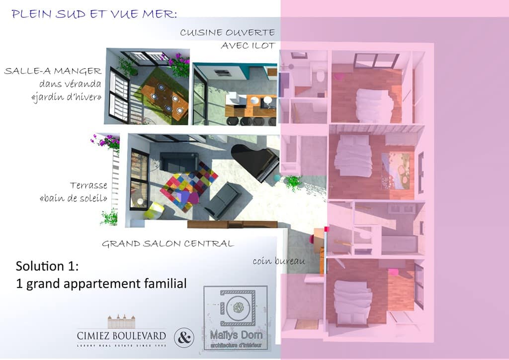 Certes, les vieux meubles, les tapisseries anciennes, ne sont plus au goût du jour. La cuisine n’est ni conviviale, ni pratique, et les salles-de-bain sont inconfortables. L’appartement, équipé de 3 chambres et 2 salles-de-bain, n’a aucun dressing, aucun wc indépendant. Mais deux critères repoussent par-dessus tout les visiteurs, et leur font oublier le potentiel inestimable de ce bien: la surface, sous exploitée, avec un hall d’entrée et des dégagements qui représentent à eux seuls 15% des m2 à la vente; et surtout, surtout, pour un appartement aussi grand, et disposant d’une superbe vue mer: l’absence d’une vraie terrasse, sur laquelle imaginer de joyeux repas surplombant la ville…