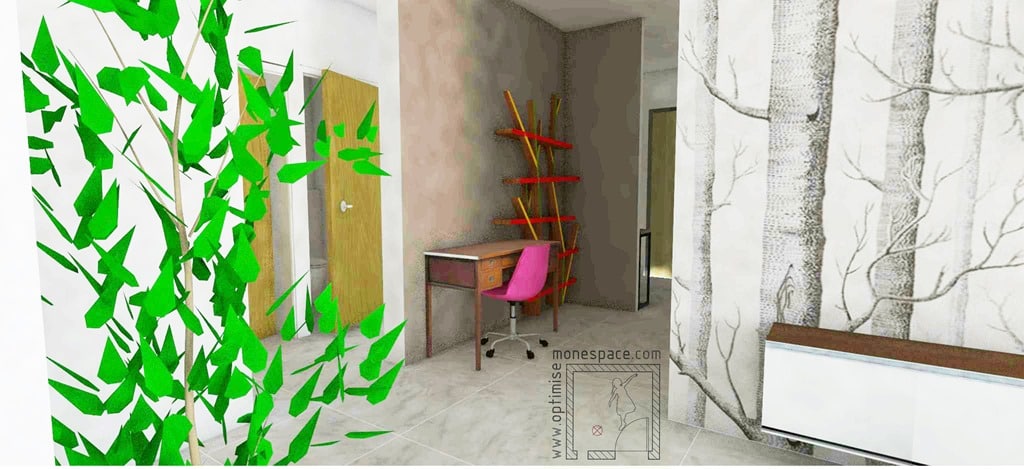 L’avantage de ce hall d’entrée immense, est sa largeur. On peut ainsi, tout-à-fait envisager de le diviser en 2 , pour offrir un coin bureau dans la seconde partie. Et hop ! On a récupéré des m2 inutilisés, pour leur offrir une vraie fonction !