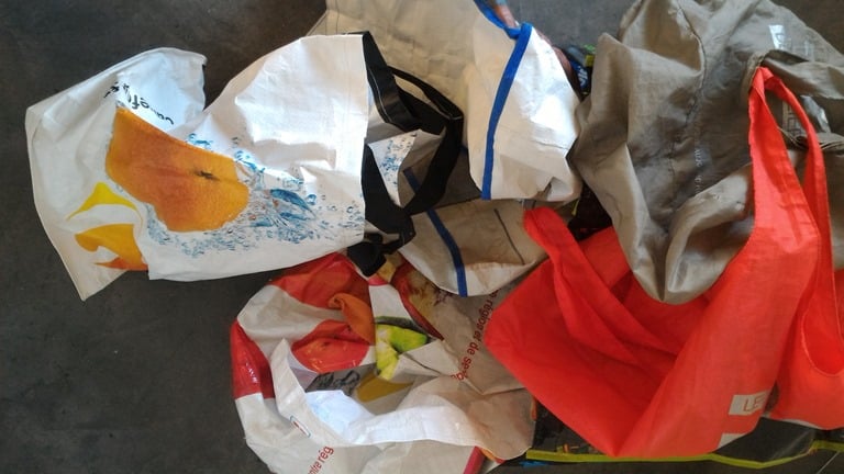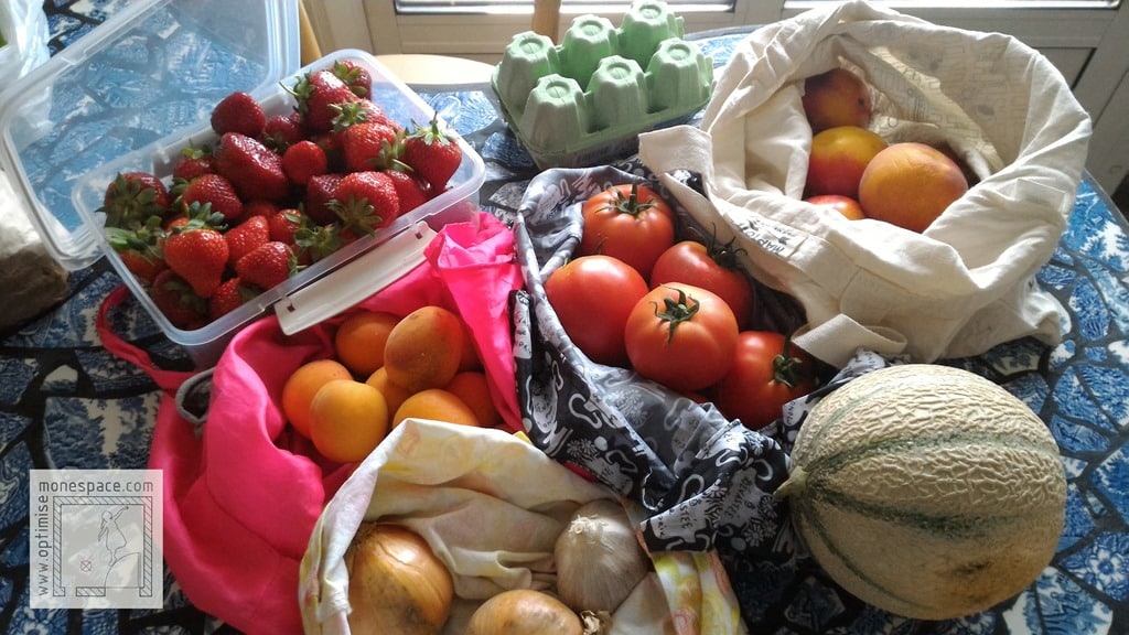 … Et là, c’est le drame. Pour chaque produit acheté, un nouveau sac plastique. Seul le marchand d’œufs propose, et même demande, de rapporter les boîtes en carton d’une semaine à l’autre. Pour tous les autres, c’est devenu quelque chose d’absolument normal : On se sert dans un panier, on fait la pesée légume par légume, et on met chaque sorte de fruits, chaque sorte de légumes, dans un sac en plastique différent. Résultat : je reviens à la maison encore une fois complètement envahie.