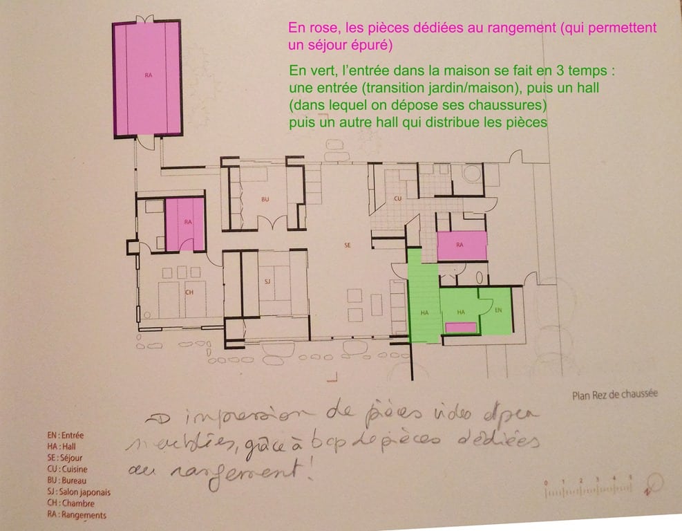 Moi, j’aime le coté murs extérieurs et jardin l’intérieur qu’on retrouve dans les patios andalous ou les riads du Maroc mais en France c’est compliqué car les plans doivent être visés par un thermicien qui exige un % d’ouvertures au sud (ce qui est peu adapté quand on vit dans le sud et qu’on veut garder la fraicheur…). J’ai aussi cette idée de dessiner depuis l’intérieur : quand j’ai dessiné les plans de ma maison, j’ai positionné la fenêtre de notre chambre pour avoir une vue sur la cathédrale d’Albi… c’est la première chose que j’ai vérifié à la livraison… et puis aussi l’idée de respecter l’histoire du terrain de ne pas vouloir à tout prix avoir un terrain plat sur une colline (je n’aimais pas particulièrement les maisons avec demi niveaux mais c’est ce qui me permettait de conserver la physionomie du terrain, mes voisins se sont empressés de tout aplanir… Bon après, je suis une grande bordélique qui a besoin d’un certain bazar pour sentir la vie qui habite le lieu et être à l’aise donc l’aspect zen n’est pas vraiment adapté…