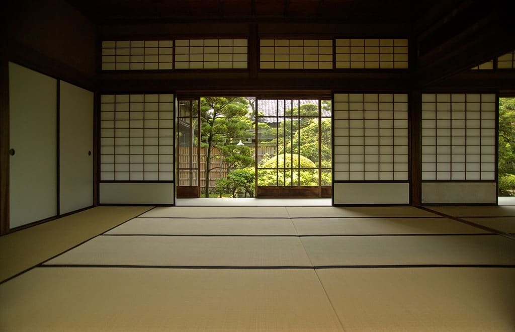 Par ailleurs, cette frontière entre l’intérieur et l’extérieur peut être traversée en passant par une zone intermédiaire, l’ENGAWA. L’engawa est réservée aux maisons avec jardin –ou donnant sur une forêt, un espace vert-, est une terrasse couverte, dans la continuité de l’intérieur. Le plancher, à même niveau, est également du même matériau que le plancher intérieur. Cette terrasse, couverte, renforce son lien avec l’intérieur de part son sol et son plafond. Dans le même temps, elle se caractérise par une ouverture totale, contrairement à nos vérandas. Ainsi, l’été, toutes baies vitrées ouvertes, les frontières dedans/dehors seront totalement floutées, et l’Engawa représente alors un “espace tampon”.