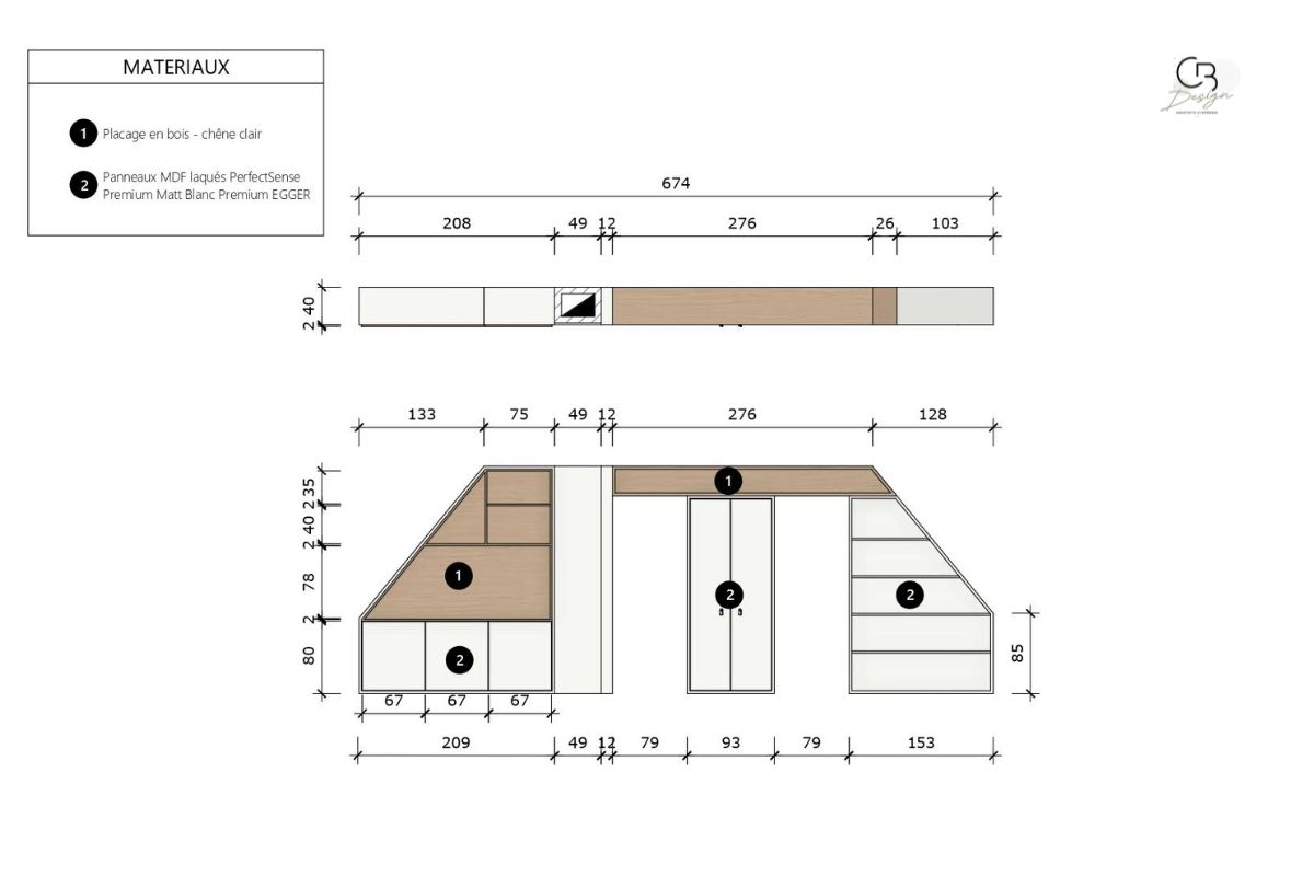 Pour ce projet, Caroline a proposé trois avant-projets sommaires. Les clients ont retenu les solutions qui leur parlaient le plus, ensuite combinées dans une version finale sur mesure. L’aménagement s’est concentré exclusivement sur le palier du R+1, sans modifier ni le RDC, ni la mezzanine existante au R+2.
