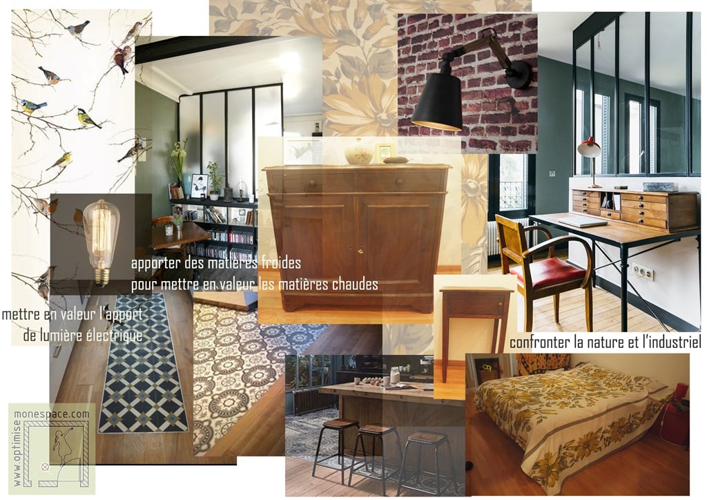 Pour cela, on mettra une couleur froide derrière le canapé rouge (bleu gris / vert), on insistera sur l’apport de motifs végétaux, et on mélangera l’ameublement “maison de famille” avec des éléments plus industriels : du métal, du béton, du verre, de la céramique …