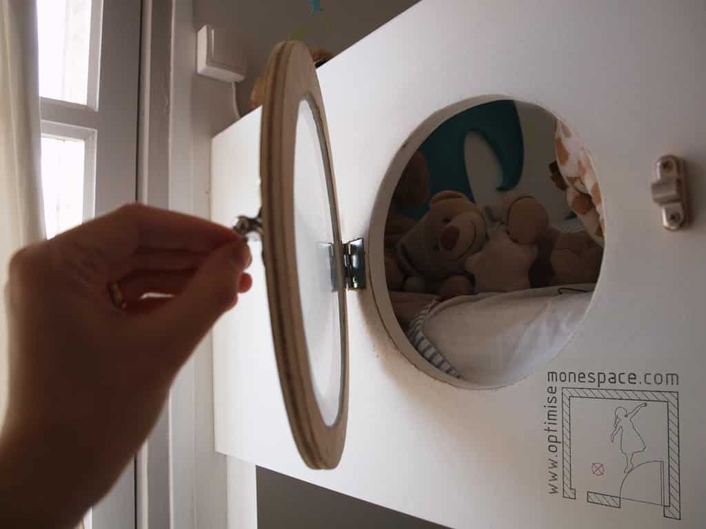 – si vous achetez un lit mezzanine, vérifiez bien qu’il soit facilement accessible: par votre enfant chaque soir et pour en redescendre chaque matin. Mais aussi par vous, pour lui faire un bisou/câlin ou pour changer ses draps. Vous pouvez aussi parfaitement fabriquer vous-même ce lit! Personnellement, c’est l’option que j’ai retenu, pour avoir un lit qui réponde à tous mes critères: suffisamment haut pour pouvoir jouer dessous, suffisamment bas pour être à hauteur de bisou le soir, facilement accessible (pas d’échelle mais un escalier), incluant du rangement, beau, et économique! Je l’ai dessiné sur la thématique d’un bâteau, et j’y ai inclus un “hublot à bisous” pour pouvoir lui dire bonne nuit sans avoir à monter dans son lit!