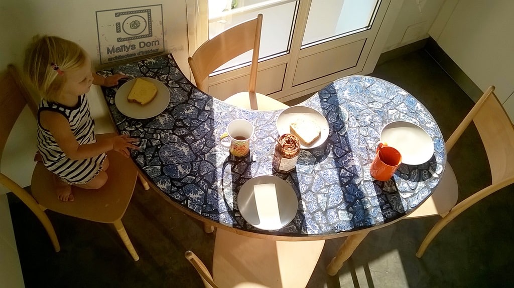 Illustration: table “Storm” permettant d’accueillir 4 à 5 personnes dans une cuisine de 7m2 tout en favorisant une circulation optimale.