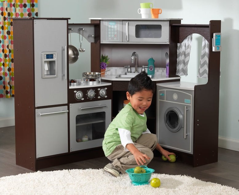 Cette cuisine-jouet pour enfants vendue sur le site des magasins « U » présente tout le confort moderne : Réfrigérateur combiné avec distributeur d’eau fraîche, gazinière, micro-ondes, évier et lave-linge. Elle correspond à ce dont la plupart des fabricants de cuisines vous parleront encore aujourd’hui : le fameux concept années 50 du « triangle d’activité » avec les zones de stockage/lavage/cuisson. Un ou deux détails XXI siècle en plus :