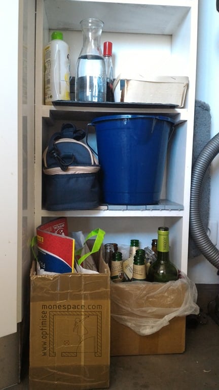 Je me suis rapidement rendu compte qu’il fallait AUSSI un bac à papier et à verre. Ces déchets n’étant pas très « sales et mal odorants », je leur ai trouvé une place dans ma mini-buanderie derrière la porte :