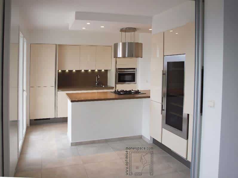 En cherchant un appartement à acheter, nous avions découvert que celui en dessous de nous était à vendre : même superficie (65 m2), mais cuisine ouverte sur le salon avec un îlot de cuisine empiétant sur le « salon » : le résultat, presque 2 murs en moins … Et beaucoup moins de confort à nos yeux : il n’y avait plus la possibilité de mettre un grand canapé et beaucoup moins de rangements dans la cuisine (contre le mur, nous avons d’un côté notre grand canapé, de l’autre il y a une desserte avec des rangements en dessous et notre grand frigo).