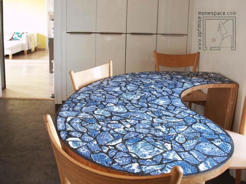 Pour réaliser cette table sur-mesure, j’ai positionné en conditions réelles mes chaises et mes assiettes tout en ouvrant tous les placards de ma cuisine, puis j’ai dessiné en direct la forme idéale sur une planche de bois ;-)
