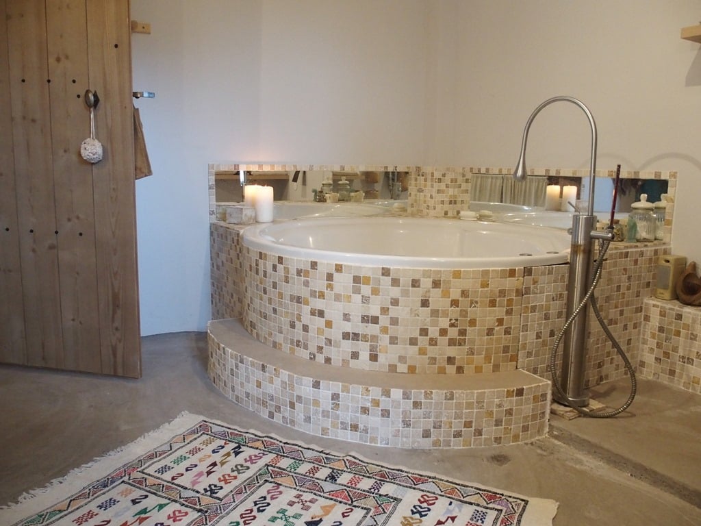 - la RECUP’ bon marché : même quand on ne trouve pas gratuit, il reste de nombreuses solutions pour avoir du “seconde main” ou du neuf de stock de super qualité à des prix dérisoires. La solution préférée de Jennifer ? leboncoin.fr . Sa référence, dès qu’elle a besoin de quoi que ce soit. Ils ont ainsi acheté une incroyable baignoire ronde (neuve !), et même un superbe lot de carrelage provenant du chantier d’un particulier qui en avait trop acheté, qu’ils ont réutilisé pour leur sdb et même pour la crédence de leur cuisine. Leur astuce déco : en customisant eux-même les cabochons qu’ils ont peint de plusieurs couleurs, ils ont réalisé une économie de plusieurs centaines d’euros rien que sur la crédence !
