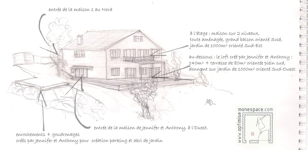 La maison était immense. Construite sur un terrain en pente, l’habitation principale était prévue sur deux étages. Mais, profitant de l’espace existant sous la maison à cause de la pente du terrain, les anciens propriétaires avaient prévu, sous leur maison, un garage d’environ 110 m² et un petit appartement d’environ 50m², donnant sur le jardin. C’est cette surface sous la maison, que Jennifer et Antony ont acheté pour seulement 125 000 €.