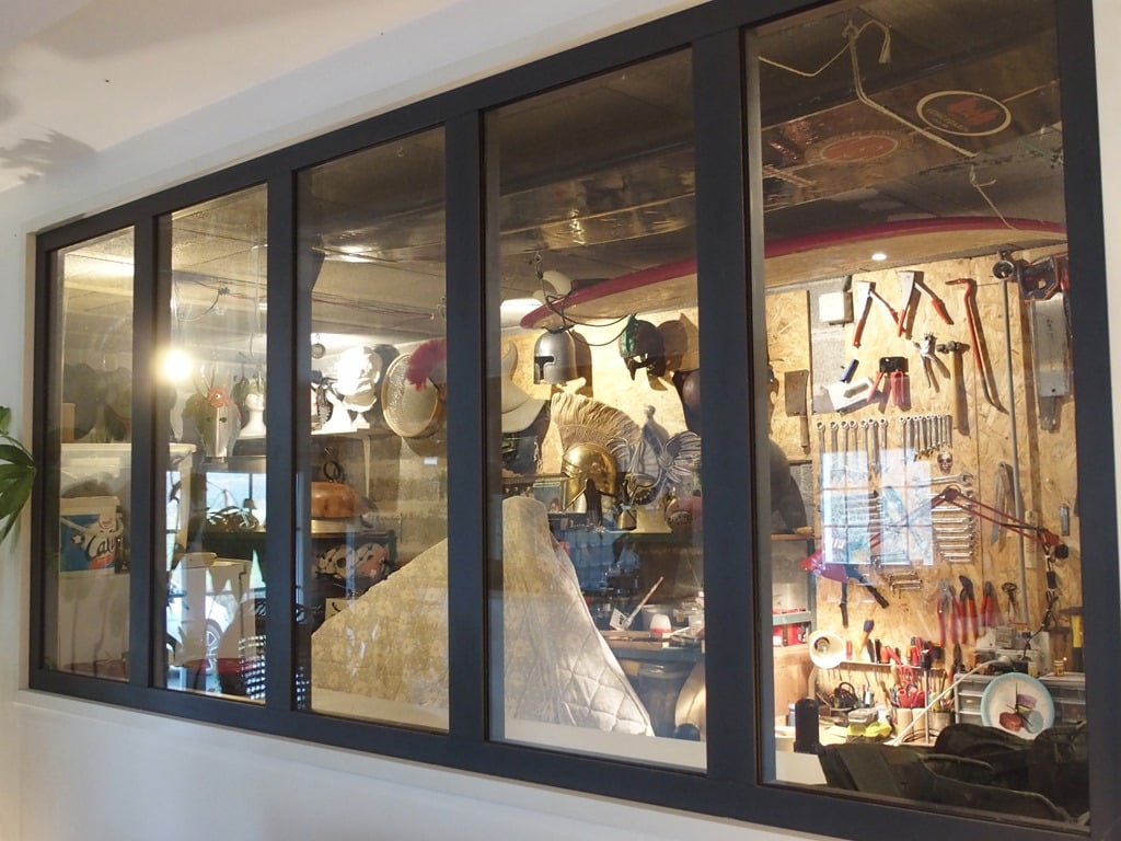 Pour réaliser les fenêtres de son atelier de bricolage, de type verrière (donnant sur séjour pour récupérer la lumière du jour), Anthony a eu la chance d’avoir, dans son lot de copains, un miroitier. Mais sachez que, pour chez vous, vous pouvez réaliser votre propre imitation avec des tasseaux peints et une grande vitre (astuce que j’utilise régulièrement chez mes clients !). Le résultat est bluffant, pour un coup divisé par 10… au moins !