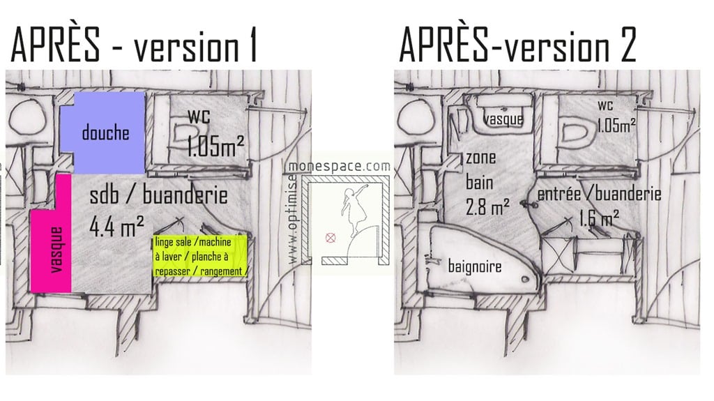 Je m’apprête à faire subir à la salle de bain une deuxième transformation: je veux des WC séparés, je les avance, je monte une cloison, je crée une porte supplémentaire pour accéder à la salle de bains. J’ajoute une baignoire gain de place sous la fenêtre qui est assez similaire à la votre (asymétrique avec un grand espace de douche), et je place la vasque à coté contre un mur de façon à ce que la lumière de la fenêtre vienne du coté plutôt que devant ou derrière. Enfin, je crée un espace buanderie derrière les toilettes avec la machine à laver, devant la seconde fenêtre, où je n’aurai pas pu mettre grand chose d’autre à cause des nombreuses gaines techniques et des contraintes d’ouverture de la fenêtre.