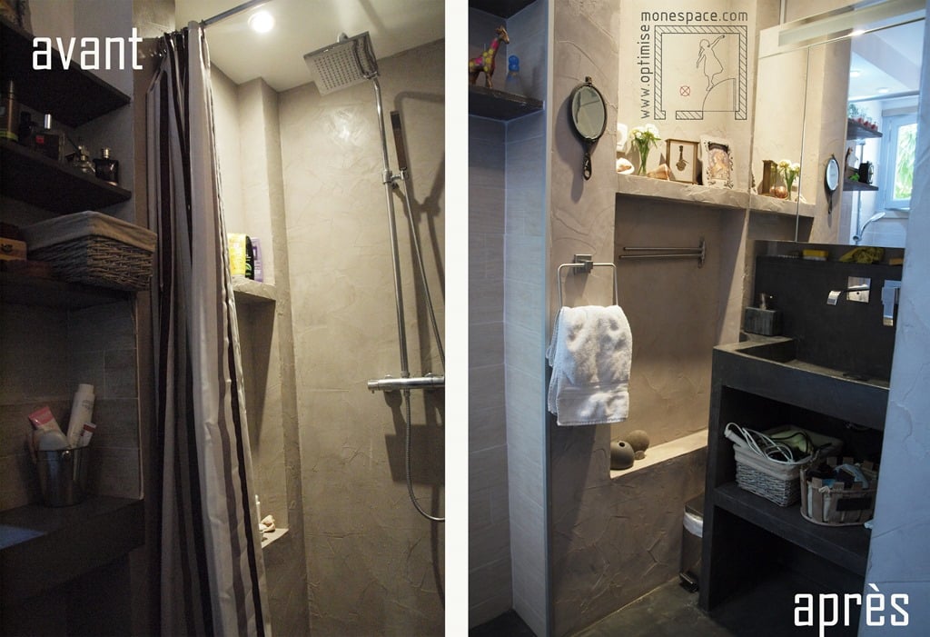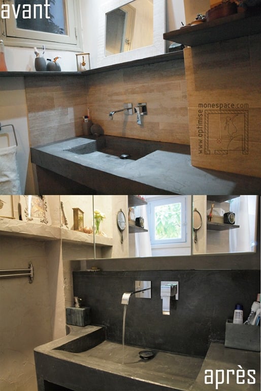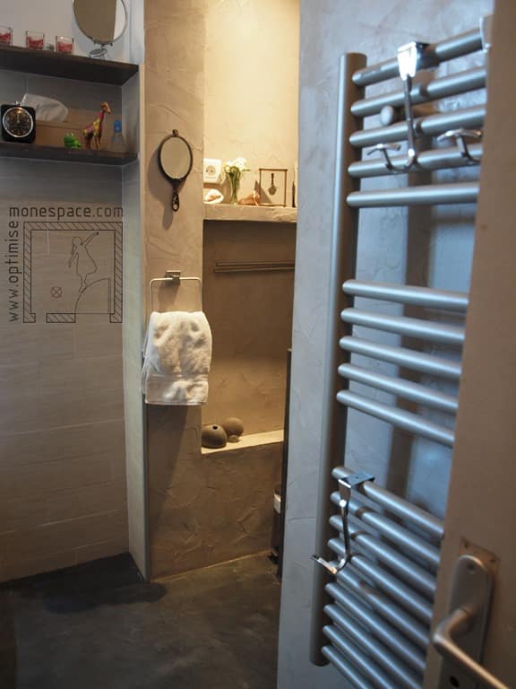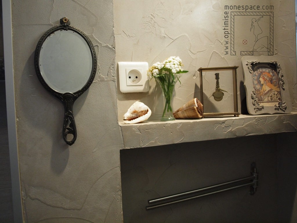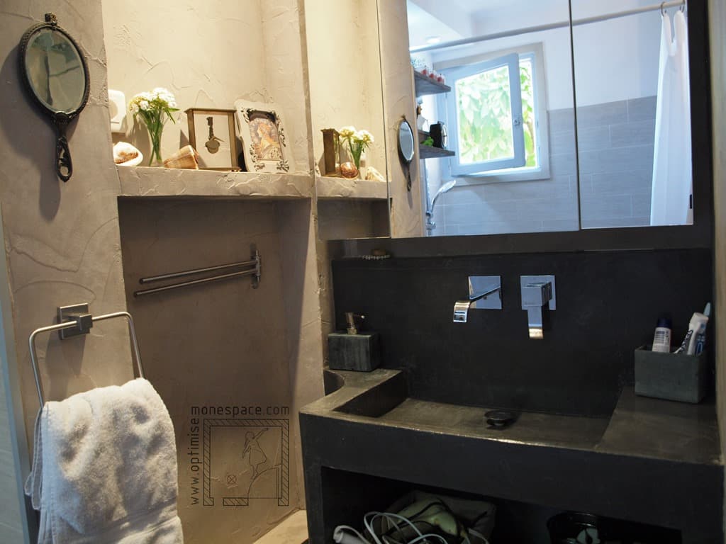 Bonjour Emmanuelle, concernant les murs de ma sdb: autour de la baignoire, revêtement carrelage imitation bois. Et le sol, les autres murs, et la vasque, sont enduis de béton ciré. L’étagère et la vasque ont été sculptées en béton cellulaire avant d’être ensuites de béton ciré.