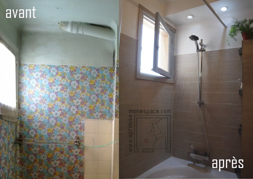 Que voyez-vous -là ? Un papier peint horrible, une douche trop petite, pas de rangement sous le lavabo, le tuyau d’évacuation des toilettes du voisin du dessus, une gaine technique qui prend de la place ?