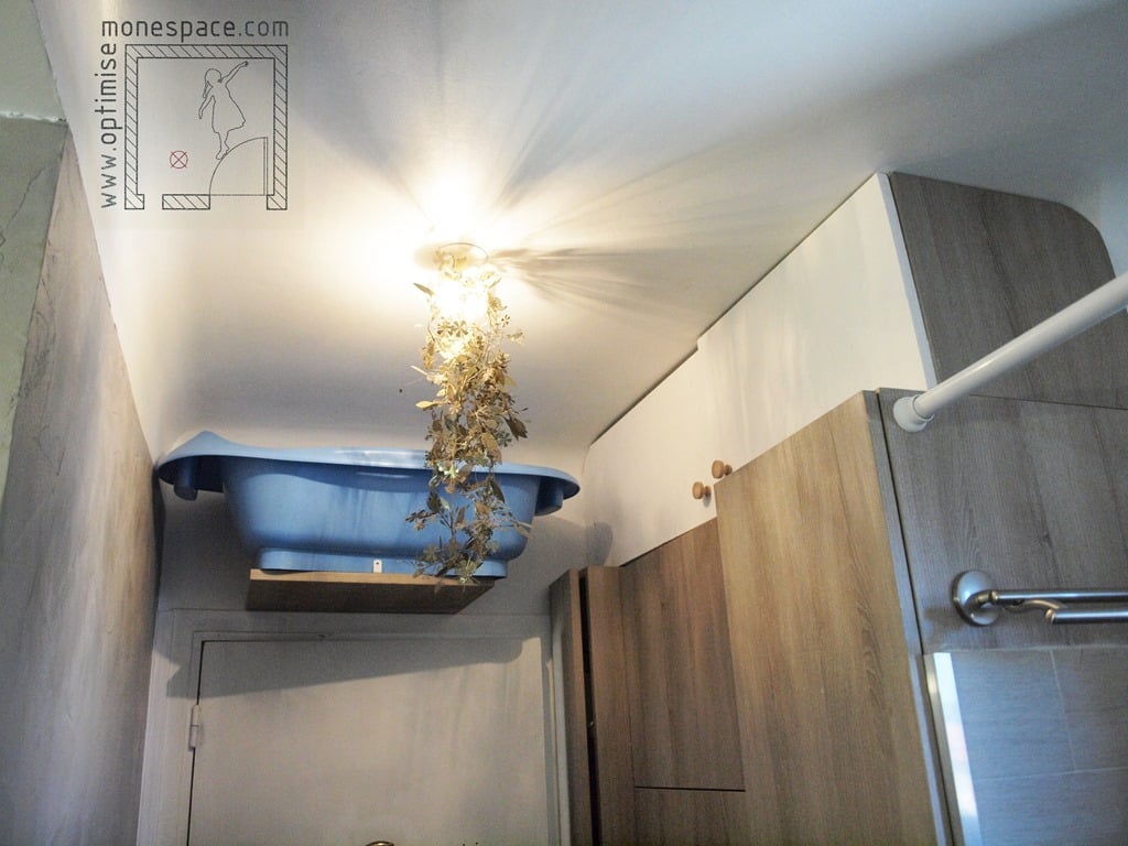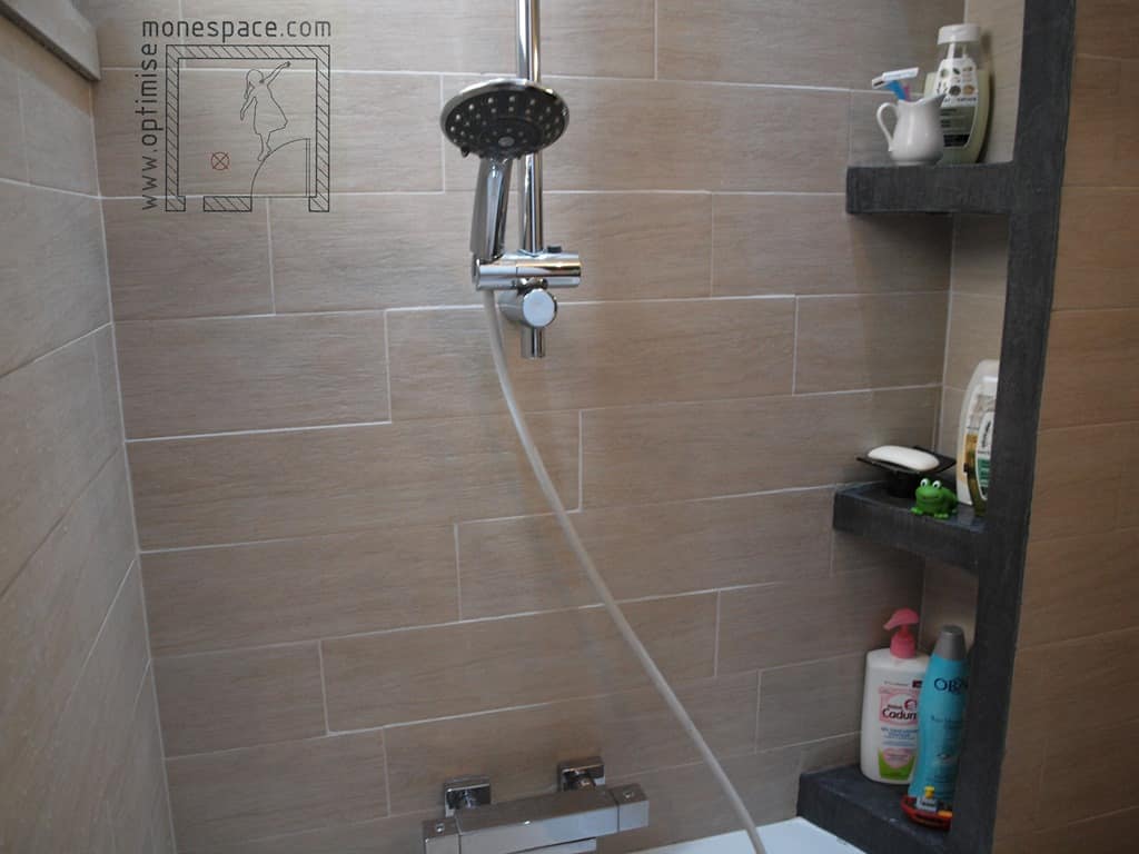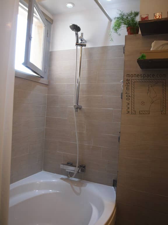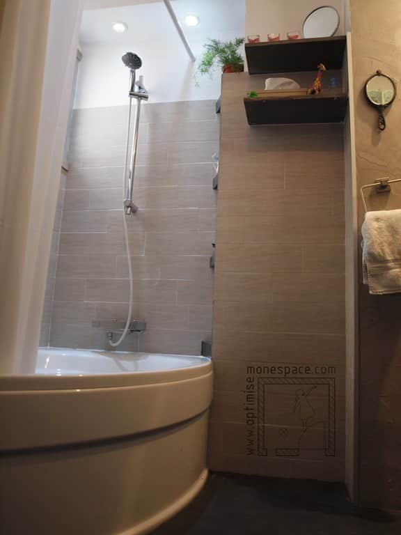 J’ai profité d’un espace vide entre la baignoire et la gaine technique, pour faire faire des étagères sur mesure, qui suivent la forme de la baignoire !