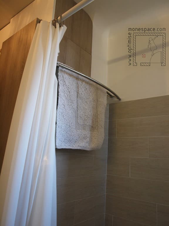 - placer des barres supplémentaires (dans la niche à gauche du lavabo), réservées aux serviettes des invités ! Comme j’ai bien optimisé le rangement dans mes placards, mes invités peuvent aussi entreposer leur trousse de toilette sous le lavabo. Quand on veut recevoir amis et famille dans un petit espace, il faut penser à ce genre de détails pour que la maison reste agréable et pas trop encombrée.