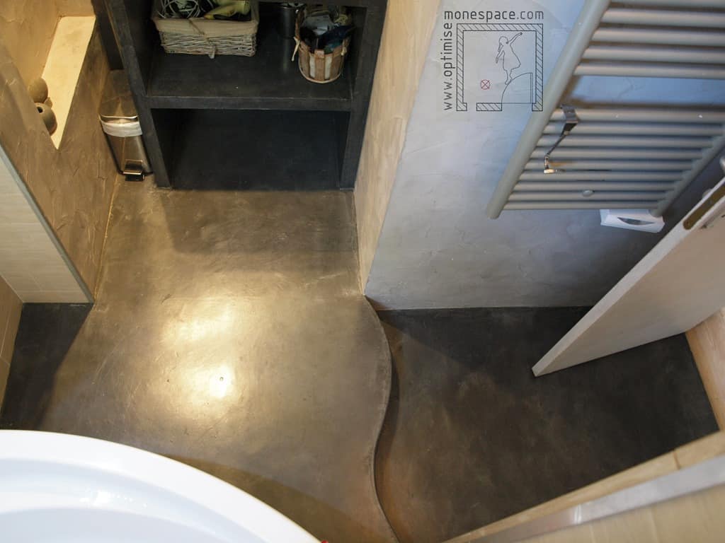 Vous remarquerez que cette fois-ci, les zones « salle de bain » et « buanderie » sont clairement définies par la marche nécessaire de 15 cm : cette marche n’était nécessaire qu’à l’emplacement du lavabo, mais j’ai préféré l’agrandir, pour mettre ma salle de bain sur estrade. Non seulement ça n’est absolument pas gênant, mais en plus, c’est très beau et ça définit bien les 2 espaces 😉