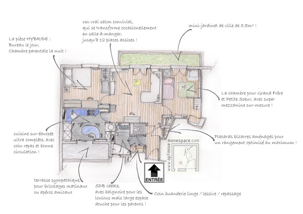Mais j’y suis arrivée : voici les 58 m² dans lesquels cohabitent en harmonie :